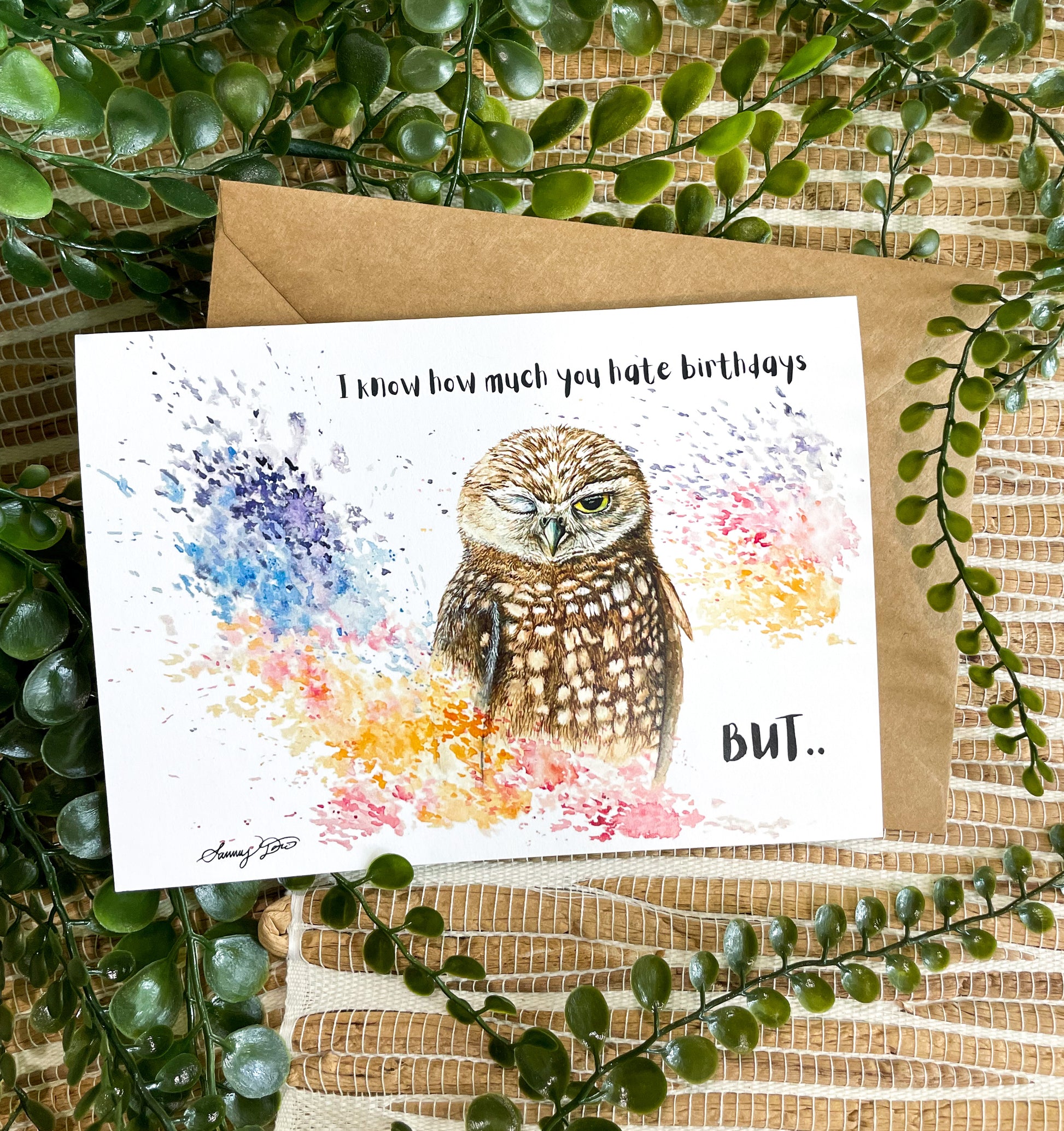 Burrowing Owl Greeting Card - "I know how much you hate birthdays but..."