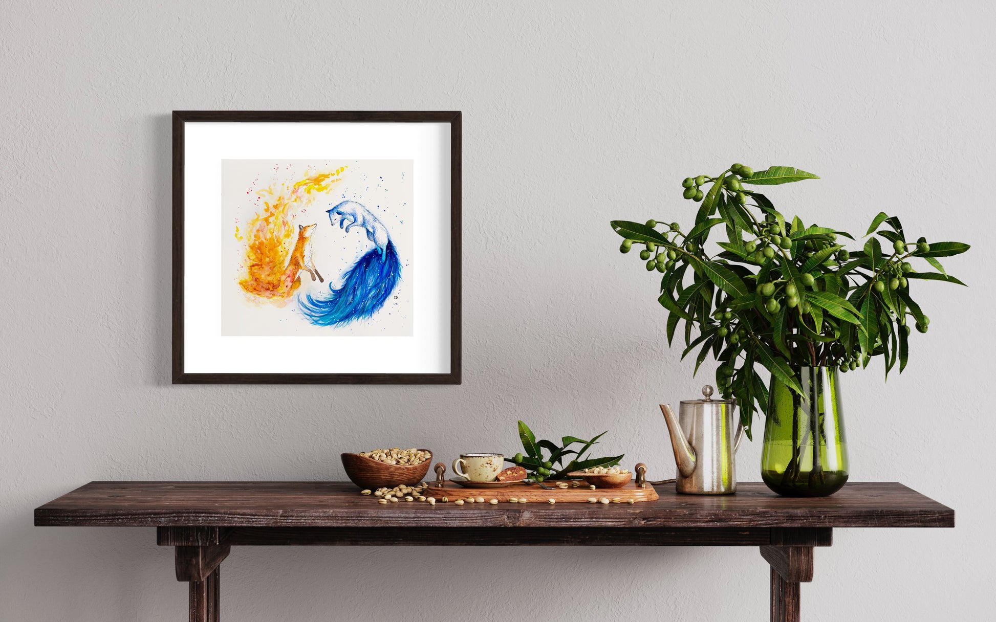 This fine art print is based off of an original watercolor painting called "Fire and Ice". Order a print and feel like you're gliding among these two majestic foxes.