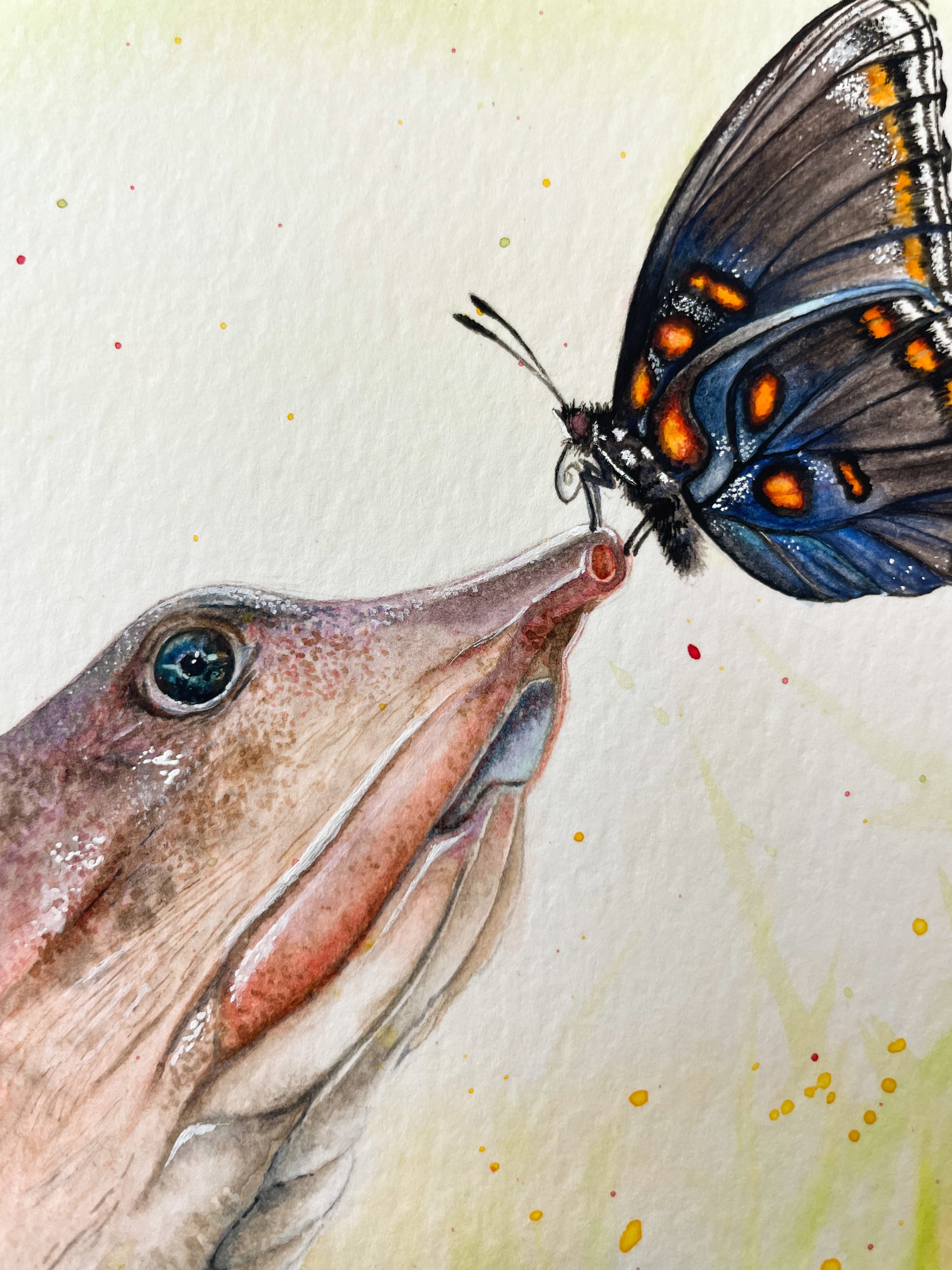 This painting is named “Little Moments” and depicts a Florida Softshell Turtle with a red-spotted butterfly landing on its nose.