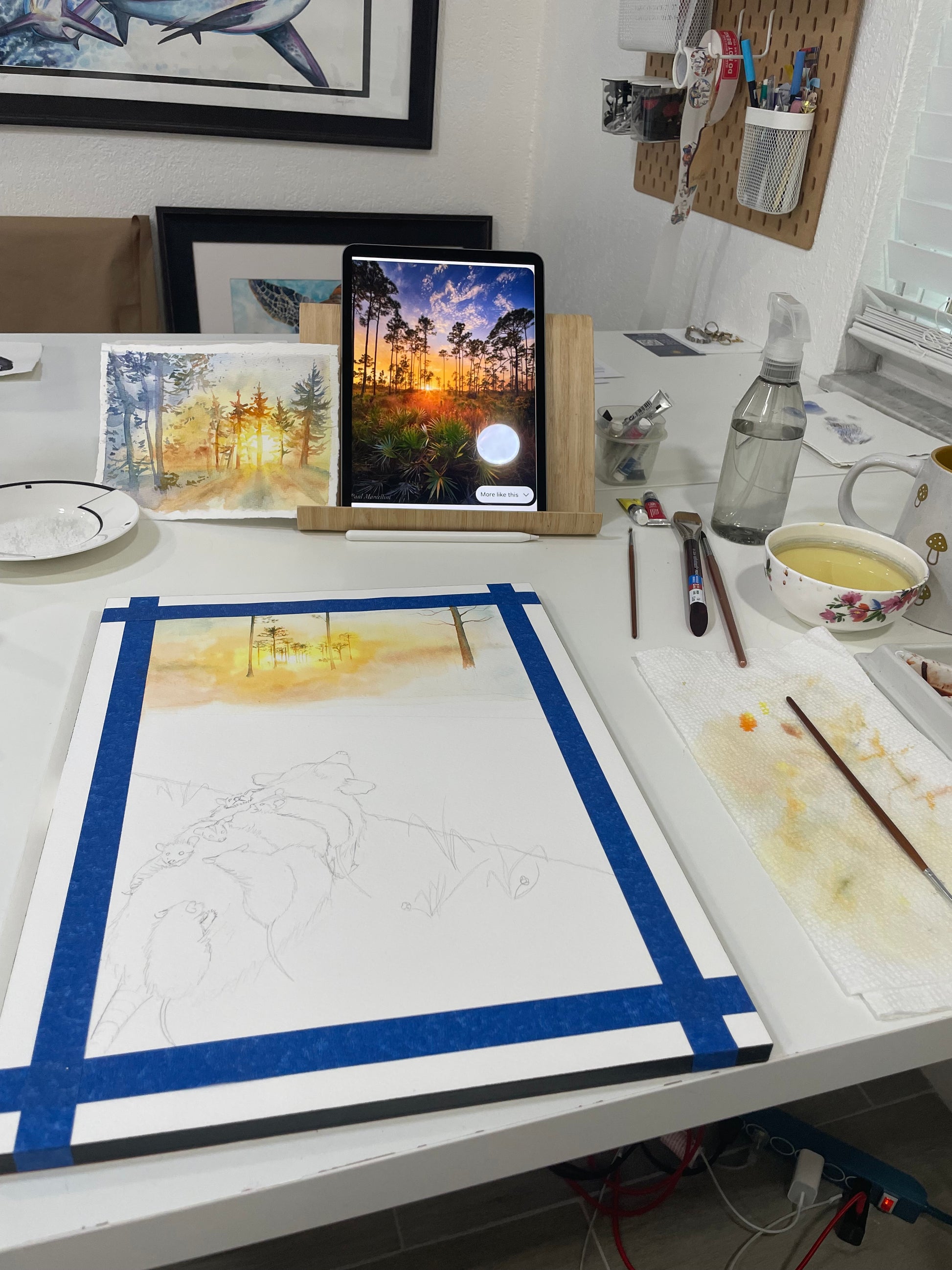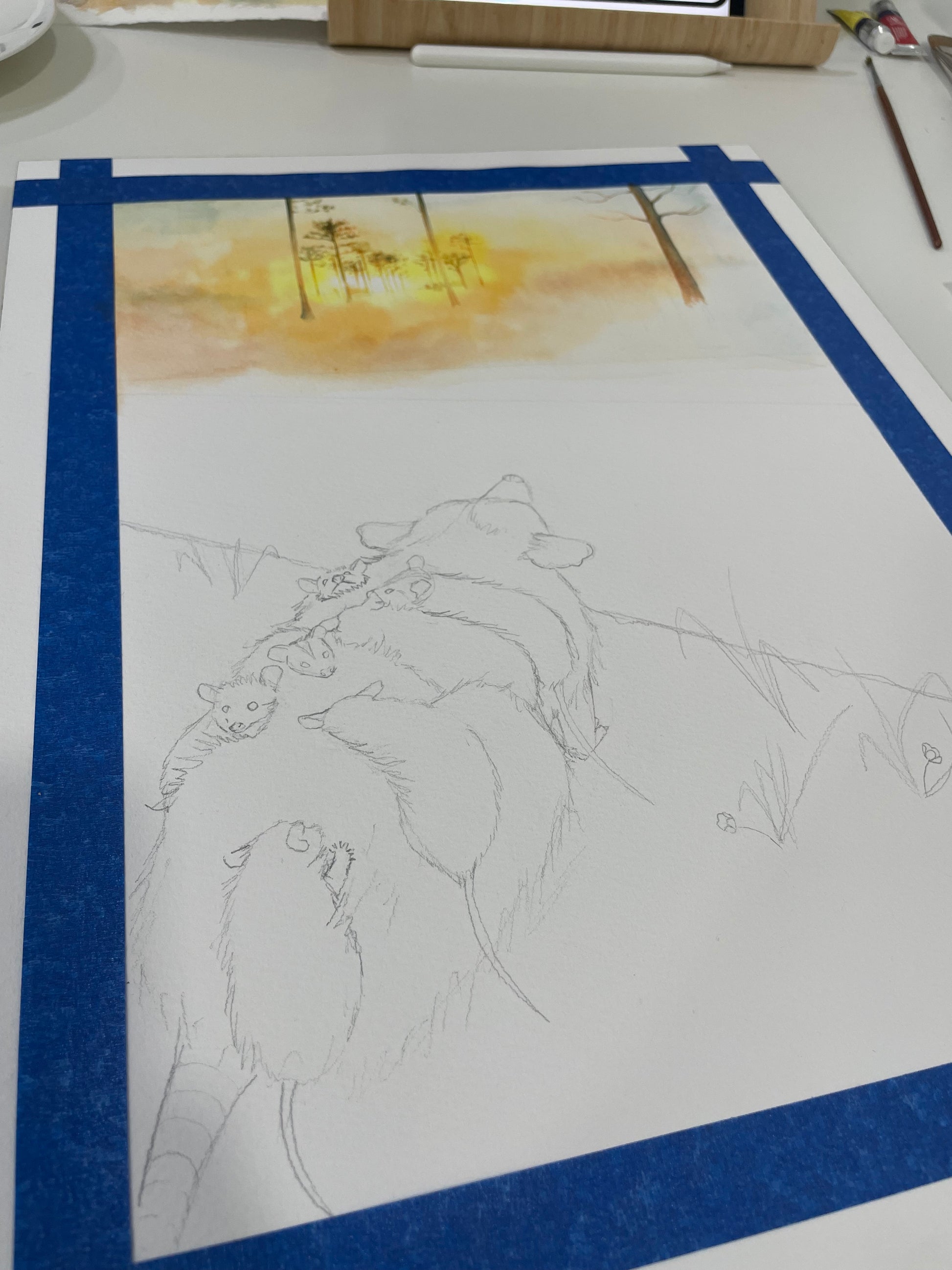 It took a full 3 weeks for Samantha to complete this incredibly detailed painting. She focused heavily on the perspective of the painting to make sure the vanishing point on the horizon, the mother opossum in the foreground, and everything in between look like they are in the right position, giving depth to the scene. She also focused on the use of light, which is incredibly vibrant and colorful during a sunset. Samantha primarily used Winsor and Newton professional series watercolor tube paints on cold press, acid free, 300 gsm Blick watercolor paper. She hand signed the front of the painting as well as the back (which she also dated with the year this painting was created - 2024).