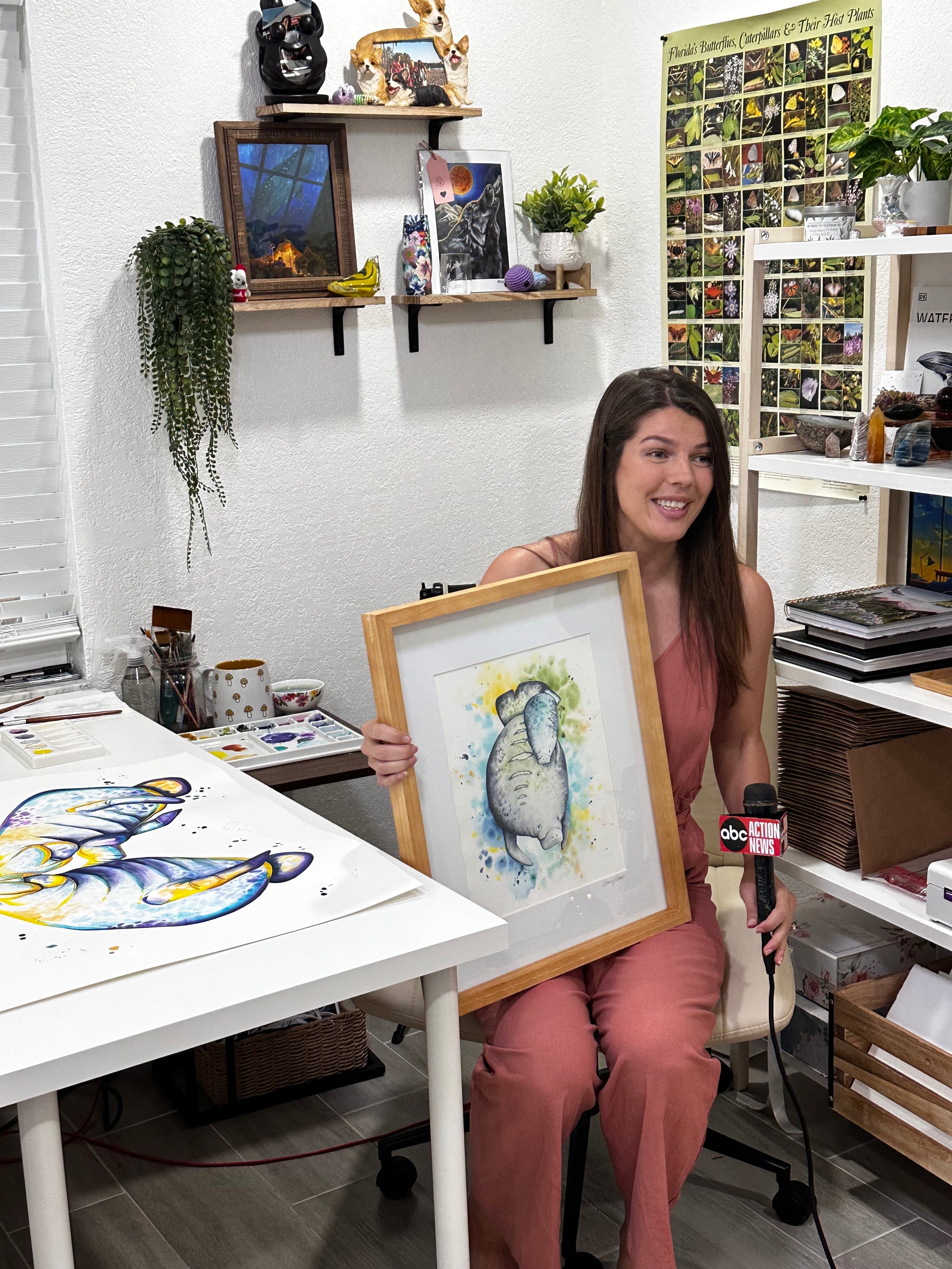 It took 3 days for Samantha to complete this adorably vibrant painting. She wanted to ensure that, although injured, the manatees still radiated positivity and light - like they are a beacon of hope. She primarily used Winsor and Newton professional series watercolor tube paints (as well as a few Daniel Smith tube paints) on cold press, acid free, 300 gsm Blick watercolor paper. She hand signed the front of the painting as well as the back (which she also dated with the year this painting was created - 2024).
