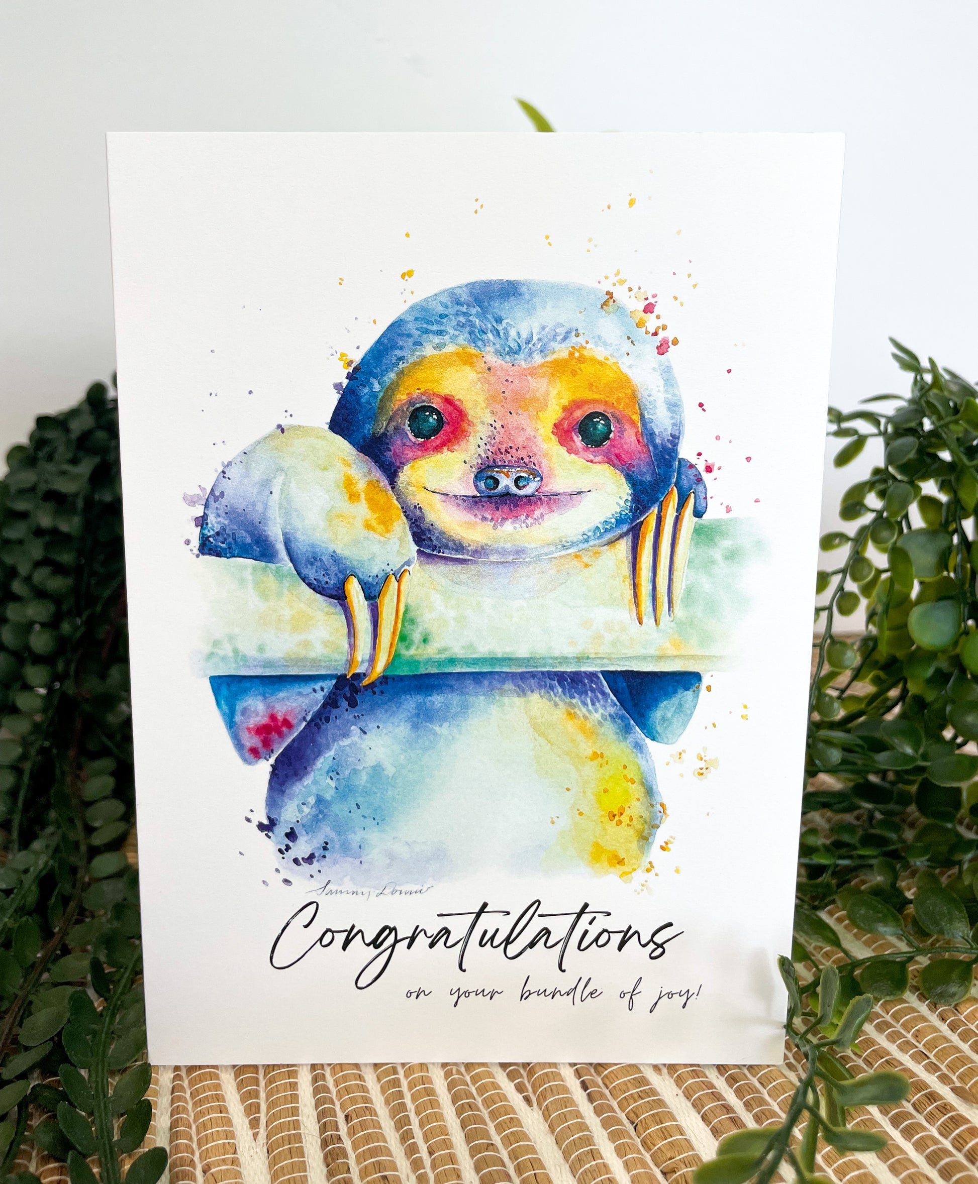 Sloth Greeting Card - "Congratulations on your new bundle of joy!"